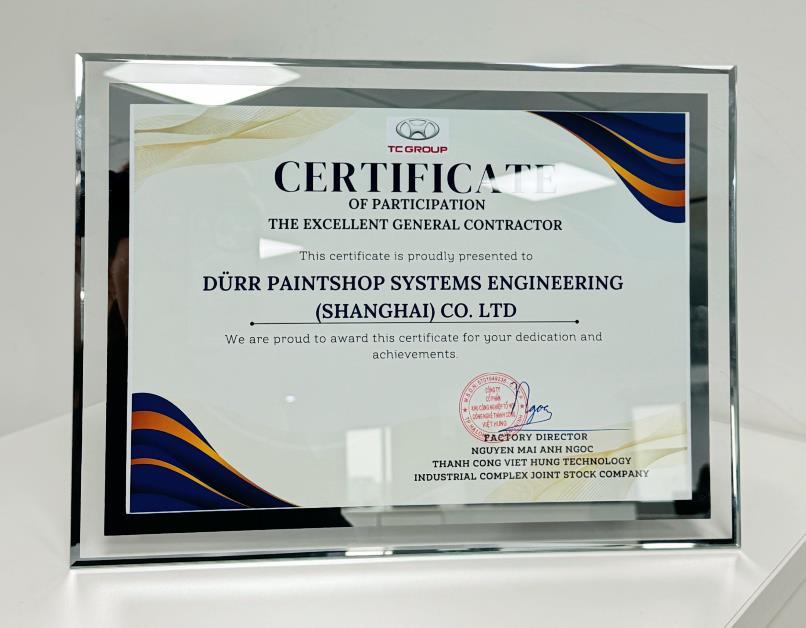 基于杜尔在项目中的出色表现, TC Motors近日授予杜尔中国“优秀供应商”称号。这一奖项彰显了双方在合作中展现的协同精神与专业技术。杜尔涂装系统工程(上海)有限公司项目经理王硕表示:“此次成功的关键在于杜尔中国与杜尔越南团队同客户之间的高效协作,各方共同努力确保了项目的圆满成功。我们对此荣誉深感自豪,它体现了团队为交付先进现代化工厂所展现的奉献精神与专业素养,正是这种精神助力我们克服了诸多挑战。”