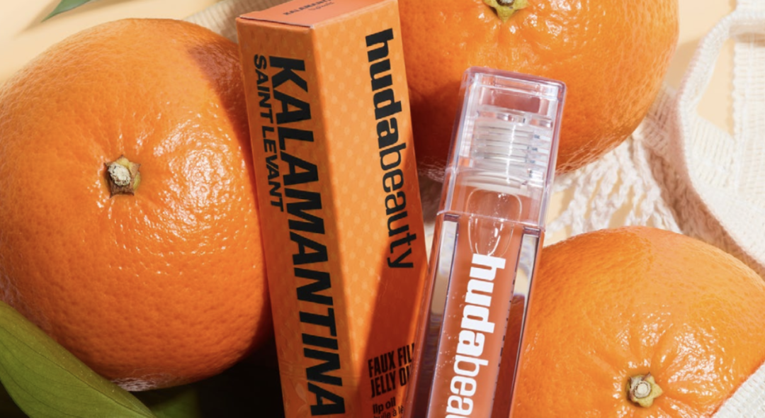 Huda Beauty 与巴勒斯坦艺术家 Saint Levant 合作推出限量版丰唇效果唇油 Kalamantina,灵感源自歌曲和巴勒斯坦传统水果。
