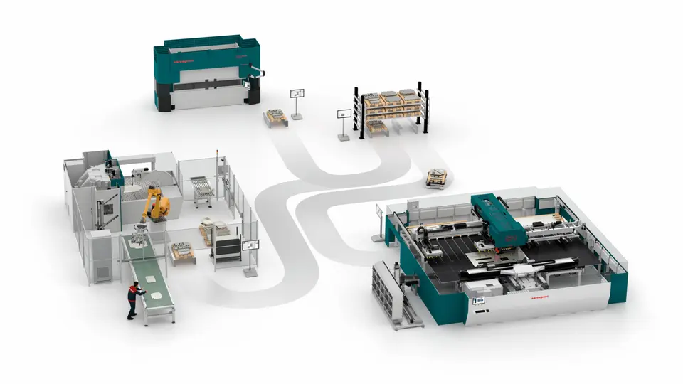 该柔性智能作业车间深度融合了先进切割技术、板料折弯与边沿加工工艺,并配备全自动机器人装置负责上下料、物料搬运及工序间传输。本次展出的FSJ单元由以下模块构成:冲裁激光复合机S1、搭载RVS机器视觉系统的机器人折弯中心P-Robot,以及全自动折边机B3.AU-TO。位于冲裁/切割与折边工序之间的智能仓储中心由OPS软件全程管控,自主移动机器人(AMR)在各工位间精准输送板材,从而实现生产流程优化、支持准时化战略、消除瓶颈环节,全面提升运营效率。该布局生动演示了智能工厂如何高效追溯并管理差异化订单、单件流生产及套件组合生产的完整流程。