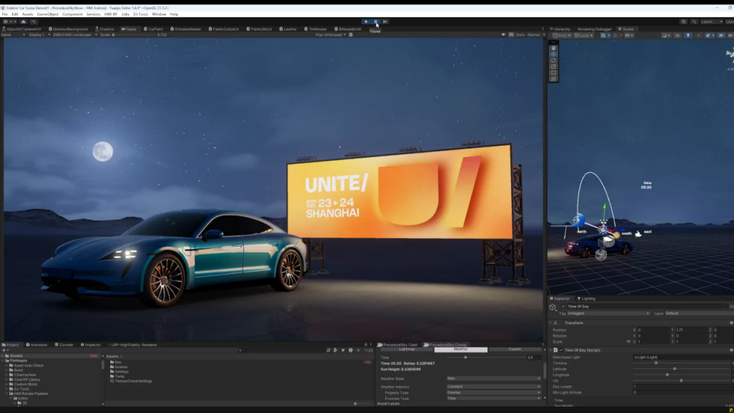 此外,团结引擎 HMI 专属渲染管线(HMIRP),在做到极致性能优化的同时,带来行业顶尖的画面表现力。HMIRP 管线提供了 24 小时昼夜变换系统、实时天气系统、实时面光源、车漆材质等丰富的模块,开发者可以一键实现高保真 3D 桌面内容,提升座舱的视觉品质,并实现品牌定制化呈现。