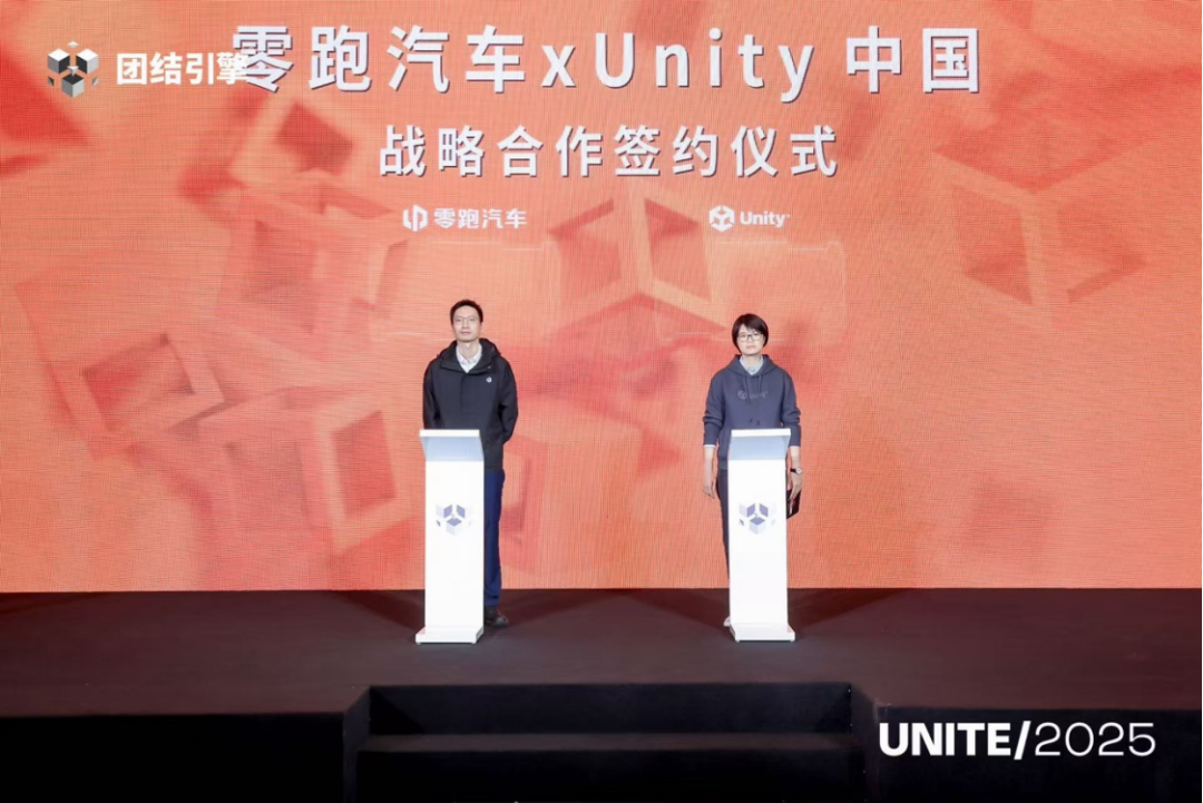 2025 年 10 月 24 日,Unity 中国与智能电动汽车的领航品牌—零跑汽车正式签署战略合作协议。Unity 中国副总裁肖蓓蓓、零跑汽车智能网联负责人赵志定出席签约仪式。