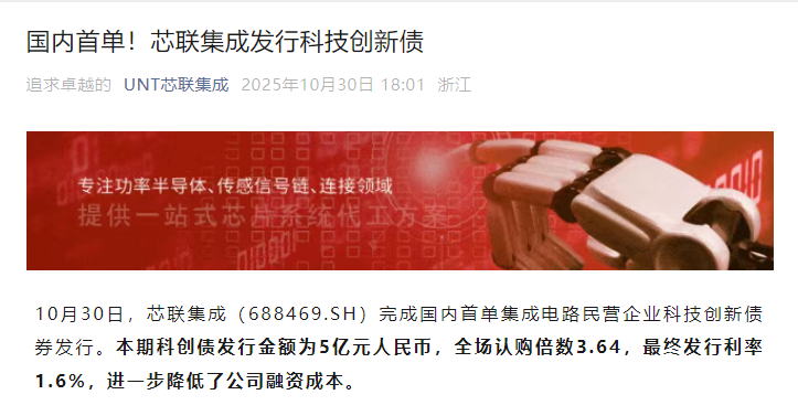 10 月 30 日,芯联集成(688469.SH)通过官微宣布完成国内首单集成电路民营企业科技创新债券发行,以 5 亿元募资规模、3.64 倍认购倍数及 1.6% 的超低发行利率,创下半导体民营制造企业直接融资新标杆,为行业破解 "研发周期长、融资成本高" 难题提供了示范样本。