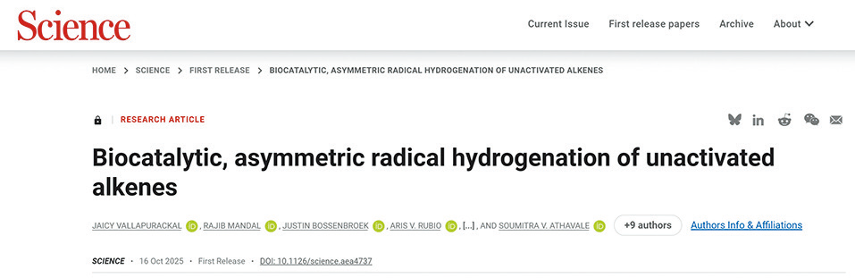 图1. 科学期刊最新发表的《非活化烯烃的生物催化、不对称自由基加氢》,来源:参考文献2