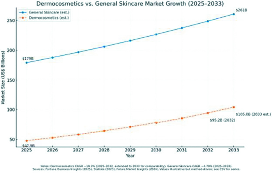 图1. 皮肤科化妆品与普通护肤品增长对比(2025-2033)