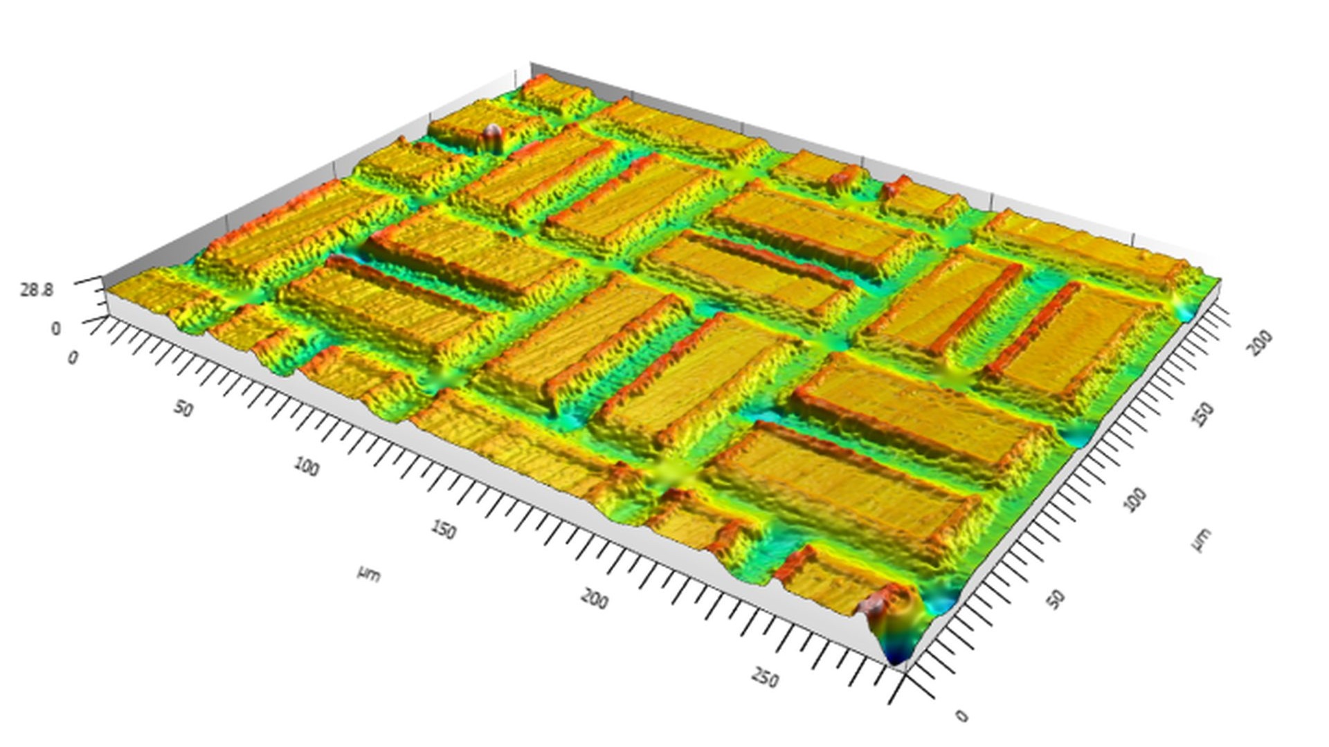 光学冲压微结构的三维表面形貌:通过静态激光脉冲生成确定性基础图案,呈现出几何特征清晰且具高度可重复性的浮雕结构