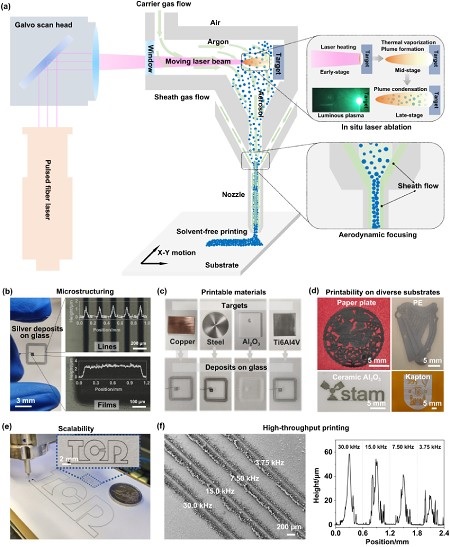 采用脉冲激光烧蚀技术,可将固体靶材转化为干式纳米颗粒气溶胶。该气溶胶通过载气聚焦后直接沉积于基材,实现功能材料的高通量、无墨印刷。LADAP技术具有多重材料印刷能力,可通过多种方式实现柔性制造