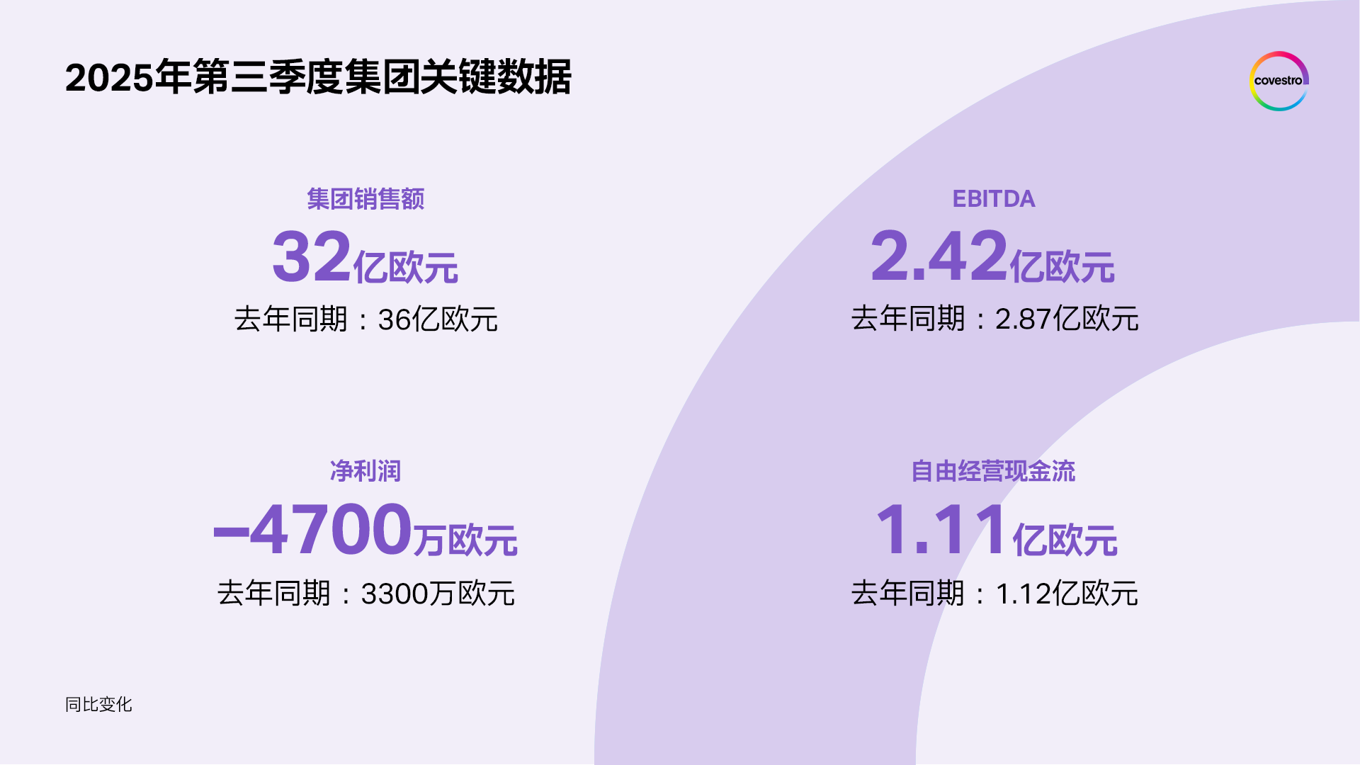 在依然充满挑战的市场环境下,科思创2025年第三季度的业绩表现符合自身预期。尽管如此,全球经济环境仍面临激烈竞争和价格压力。影响业绩的主要因素包括:主要销售市场需求持续疲软以及由此造成的供过于求;同时,多马根化工园区一处外部变电站发生火灾,导致多座工厂停产,进一步影响业绩表现。受销售价格下跌、汇率波动及销量下滑影响,销售额和盈利水平均低于去年同期。集团销售额下降12%至32亿欧元(去年同期:36亿欧元)。息税折旧摊销前利润(EBITDA)为2.42亿欧元(去年同期:2.87 亿欧元),其中多马根火灾事故对此造成了数千万欧元的负面影响。集团合并净利润为-4700万欧元(去年同期:3300万欧元),自由经营现金流为1.11亿欧元(去年同期:1.12亿欧元)。