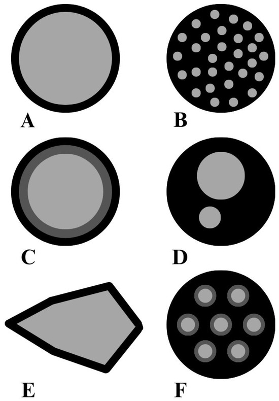 不同类型的微胶囊结构:(A)简单微胶囊,(B)微球,(C)多壁微胶囊,(D)多核微胶囊,(E)不规则微胶囊,(F)微胶囊组装体,聚合物层用黑色和深灰色表示,浅灰色表示活性物质