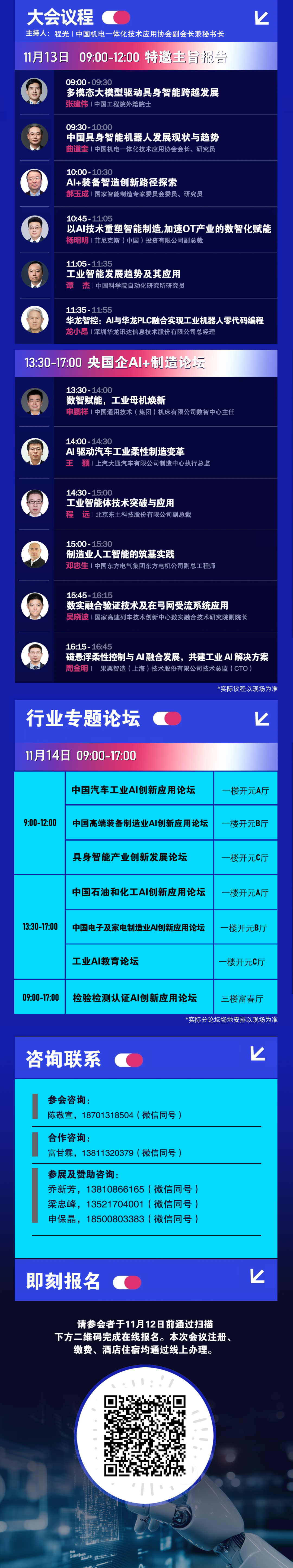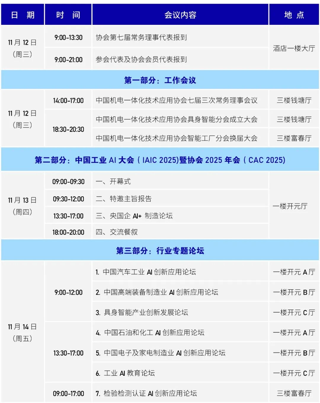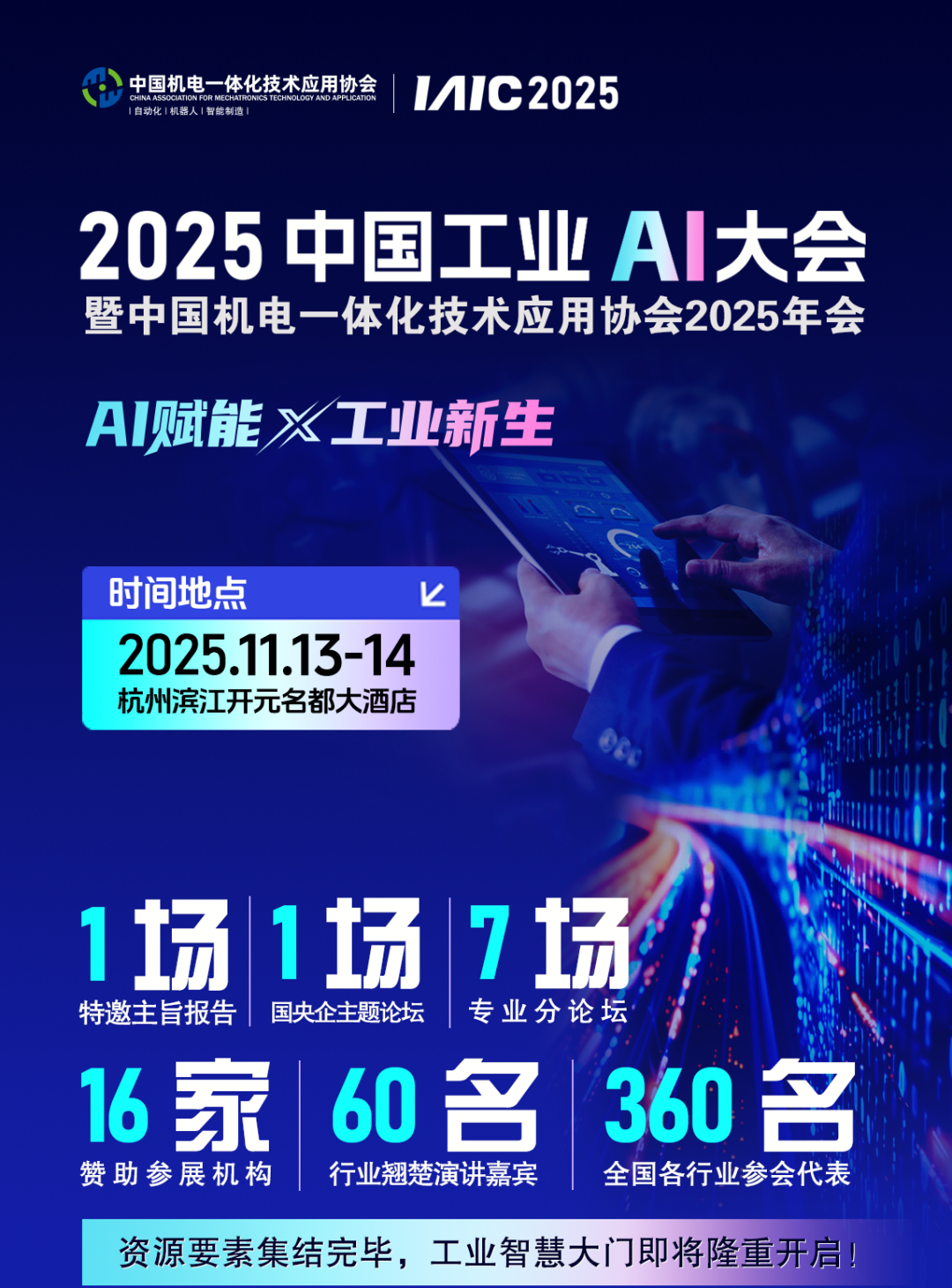 为深入贯彻《国务院关于深入实施“人工智能+”行动的意见》精神,抢抓人工智能发展新机遇,推动人工智能与工业深度融合,以AI+制造推动AI智能体深度赋能产业发展,中国机电一体化技术应用协会定于2025年11月12-14日在浙江省杭州市召开“中国工业AI大会(ICIA 2025)”。同期还将举办“中国机电一体化技术应用协会2025年会”“中国机电一体化技术应用协会七届三次常务理事会”“中国机电一体化技术应用协会具身智能分会成立大会”“中国机电一体化技术应用协会智能工厂分会换届大会”。