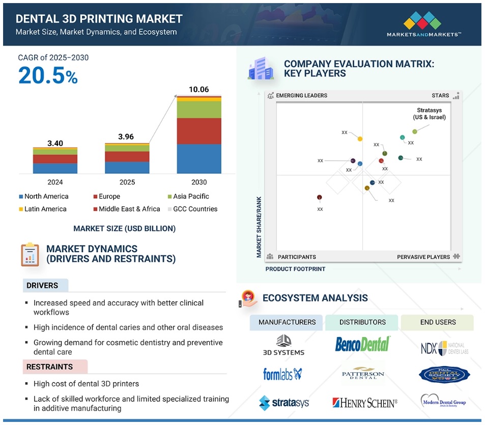 据市场研究与咨询公司Markets and Markets发布报告,全球牙科3D打印市场在2024年估值为34亿美元,2025年已达到39.6亿美元。预计从2025年到2030年,该市场将以20.5%的强劲年复合增长率持续增长,至2030年底,预测估值将攀升至100.6亿美元。