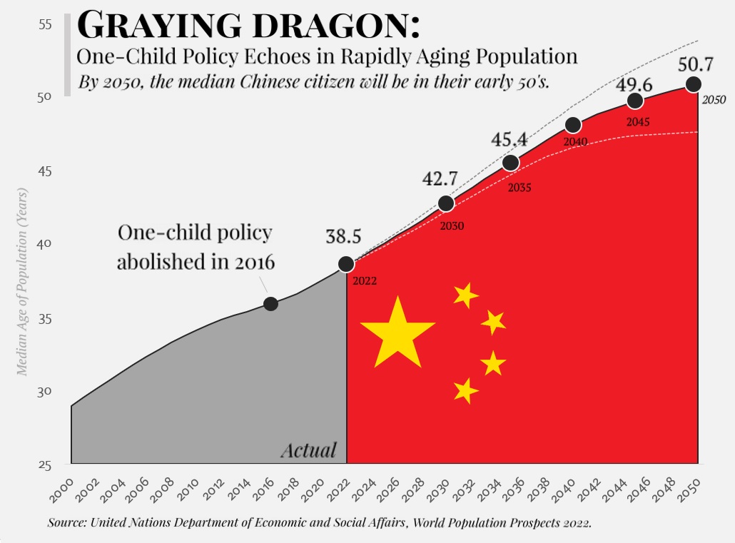 根据联合国经济和社会事务部在2022年发布的全球人口展望报告,至2050年,中国国民年龄中位数将突破50岁。相比“平均寿命”,年龄中位数更能直观反映人口的“整体年龄结构”,是衡量一个国家老龄化程度的核心标尺。中位数的数值越高,代表这个国家越“老”