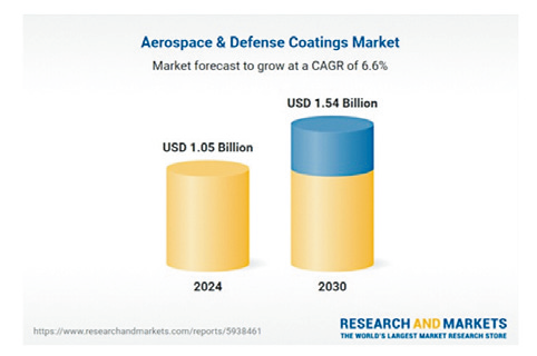 根据ResearchAndMarkets.com发布的《航空航天与国防涂料市场全球产业规模、份额、趋势机遇与预测(2020-2030)》报告显示,2024年航空航天与国防涂料市场规模达10.5亿美元,预计到2030年将增长至15.4亿美元,年复合增长率为6.62%。