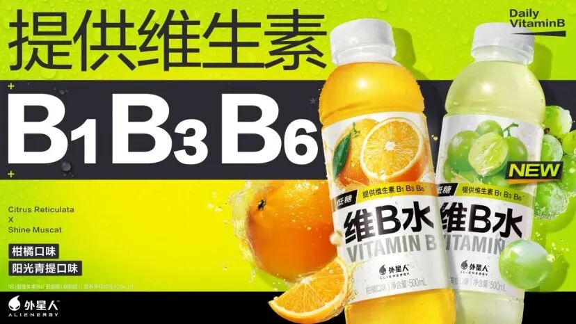 2025年,外星人推出维生素B水,品牌在发布添加了维生素B6和烟酸的外星人维C水后,又给消费者以新选择。品牌表示,维生素B水针对日常饮食种类少、熬夜加班状态差、紧张焦虑压力大等人群的需求,低糖低卡。其口感酸甜清爽,有柑橘和阳光青提两种口味。