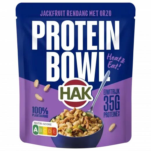 2025年2月,荷兰品牌HAK推出一款Jackfruit rendang met orzo蛋白碗,每份带来超过35克蛋白质。(注:Jackfruit rendang是传统印尼仁当炖牛肉的植物基版本。菠萝蜜仁当搭配的Orzo为米粒型意面,类似米饭配仁当的角色。)