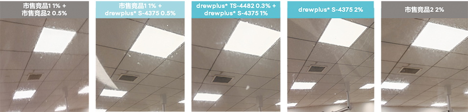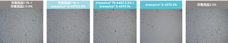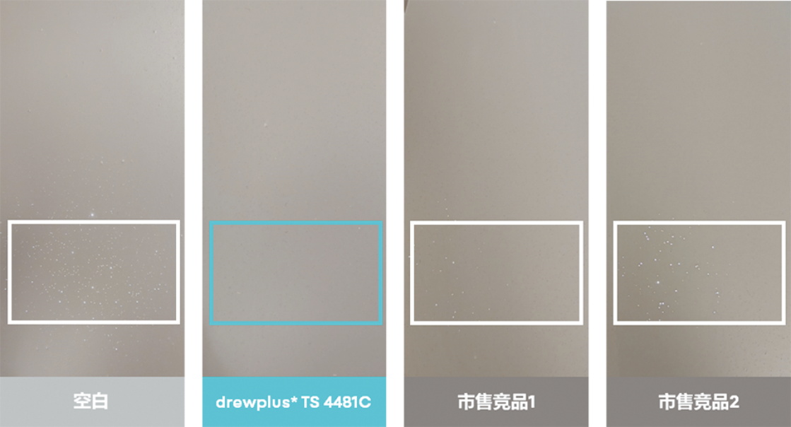 ** 仅指漆膜表面相对完整、视觉美观度高。drewplus* ts-4482和drewplus* s-4375是卓越的消泡解决方案,并从此维度助力实现客户满意的、高质量的漆膜效果。本文提及的实验对照产品仅为部分市售产品,相关实验数据和信息仅供参考。
