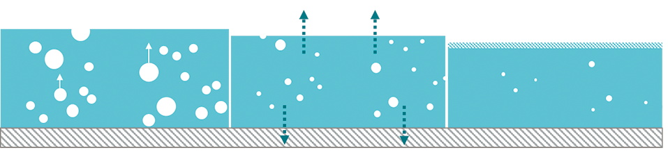 针对水性工业涂料难消泡的问题,亚什兰独家溶泡技术就是专为该场景所开发的。根据斯托克斯定律(v ~r2/η),气泡在水性涂料体系上升的速度主要取决于涂料粘度(η)和气泡的大小(r)。所以,当水性涂料通过无气或空气辅助喷涂施工时,涂料粘度相对较高,涂层中的微泡便很难上浮到液体表面以破除。亚什兰溶泡技术的消泡剂运用了特殊的消泡剂粒子,消泡剂的活性成分可以吸附在泡膜上,给被包覆的气体打开释放通道。泡沫中的气体有了释放通道,就能逐渐溶解到液相,最终扩散到空气中。此外,在水性工业涂料干燥过程中,当涂层处于液相的状态或涂层已达到表干状态但表层下仍是可流动的液相时,溶泡技术仍能持续溶解微泡,继续发挥消泡作用。