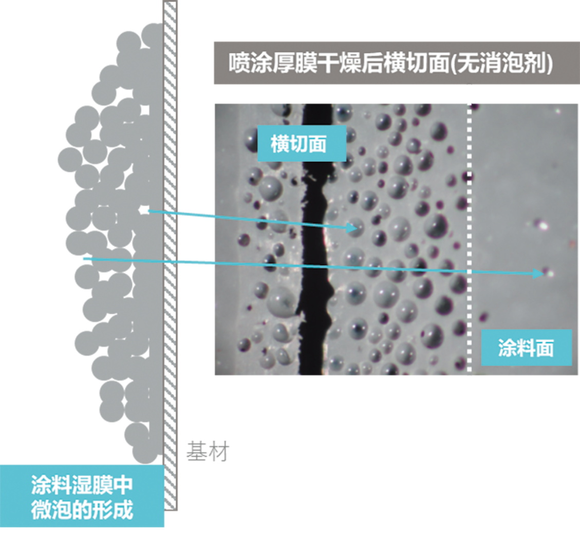 以工业涂料常规的喷涂施工为例,当漆雾粒子通过机械剪切以球形的状态离开枪口,并在空气中飘散,最后铺展到基材上。漆雾粒子会进行堆叠使涂层达到一定膜厚和丰满度。正是在这堆叠的过程中,粒子和粒子之间留下了孔隙和残存的大量空气(如下图)。这些在喷涂施工中产生于漆膜中的泡沫,如果没有得到很好的控制,则会对漆膜整体外观和防护性能都产生严重影响。另外,随着对施工效率的要求不断提高,水性涂料施工中无气或者空气辅助喷涂的场景也越来越常见,如水性木器涂料往复机喷涂、水性工业防腐涂料无气喷涂等。这类施工中,漆雾球形粒子会更大,粒子与粒子间的孔隙也会随之增大,混入的空气也更多。此类施工中所用涂料的粘度也往往很高。所以,这种情况下对于漆膜中的泡沫控制则需要全新的技术与解决方案。