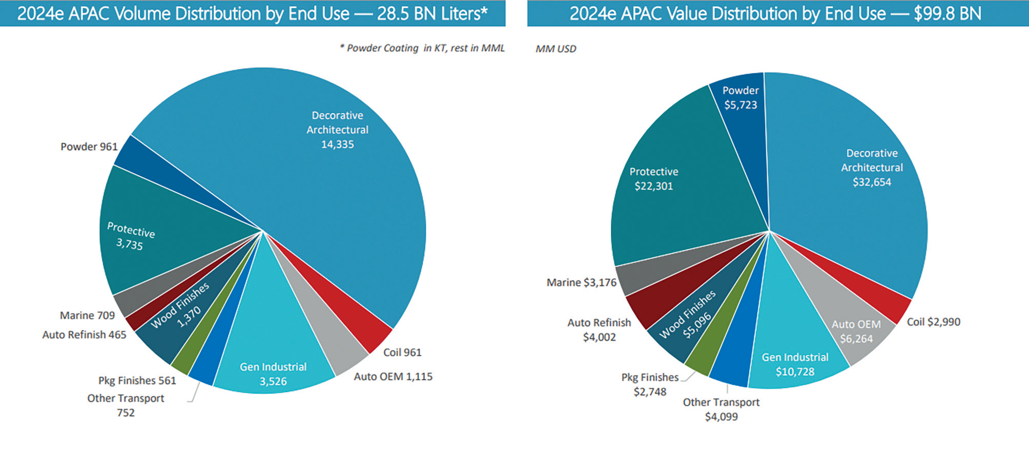 图6详细列出了2024年亚太涂料市场按终端用途分类的细分数据。无论是产值还是销量,装饰建筑涂料都以绝对优势占据最大细分市场,防护涂料和通用工业涂料构成第二第三大应用领域。尽管海洋涂料产量仅7.09 亿升,但其价值达31.8亿美元,单位价值最高。特种领域如粉末涂料和汽车原厂漆也在价值层面占据重要地位,凸显出亚太市场同时具备规模优势和高价值转型趋势。