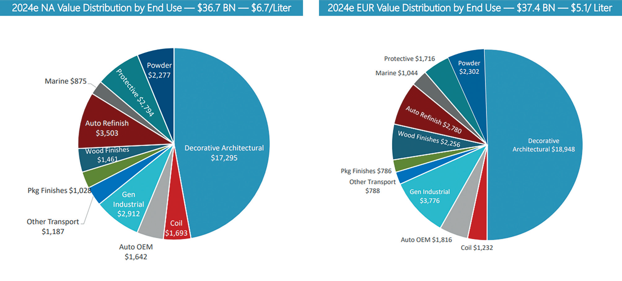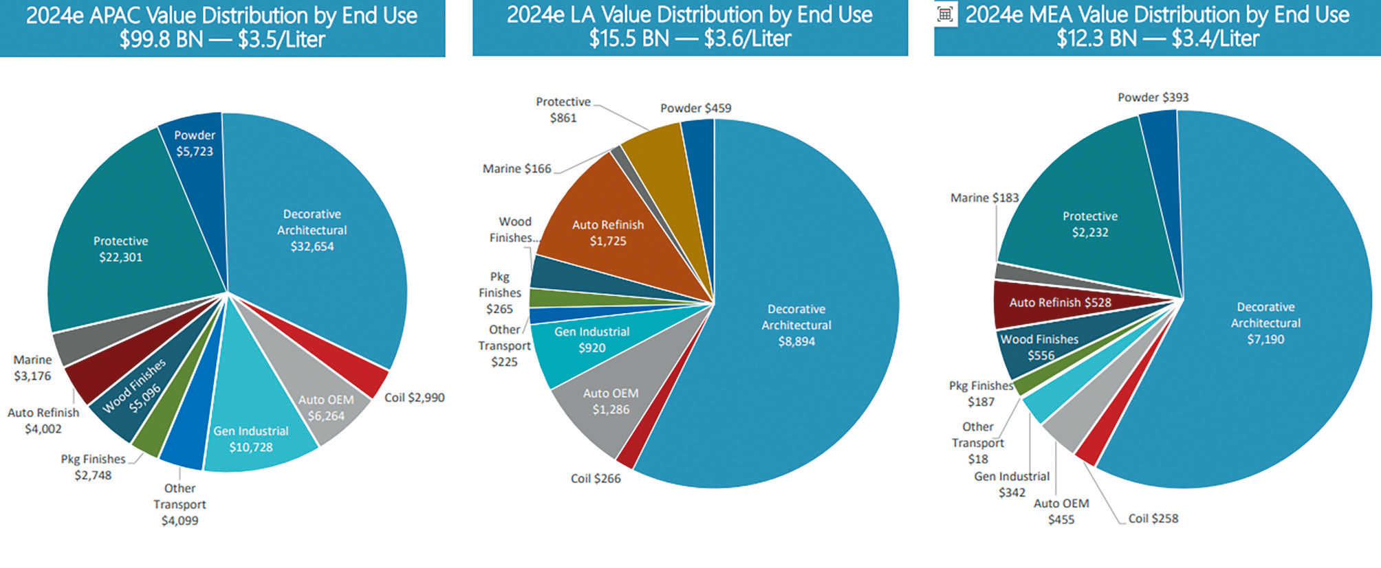 图2和图3可以看出,北美、欧洲等成熟市场均以装饰建筑涂料为绝对核心(分别占47%和51%的产值份额),同时在汽车OEM、工业漆等高技术、高附加值领域占比显著。