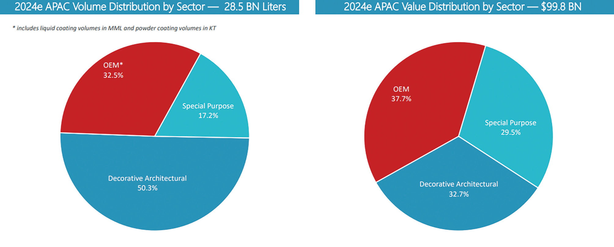 图5. 2024年亚太地区涂料销量和产值按类别分布