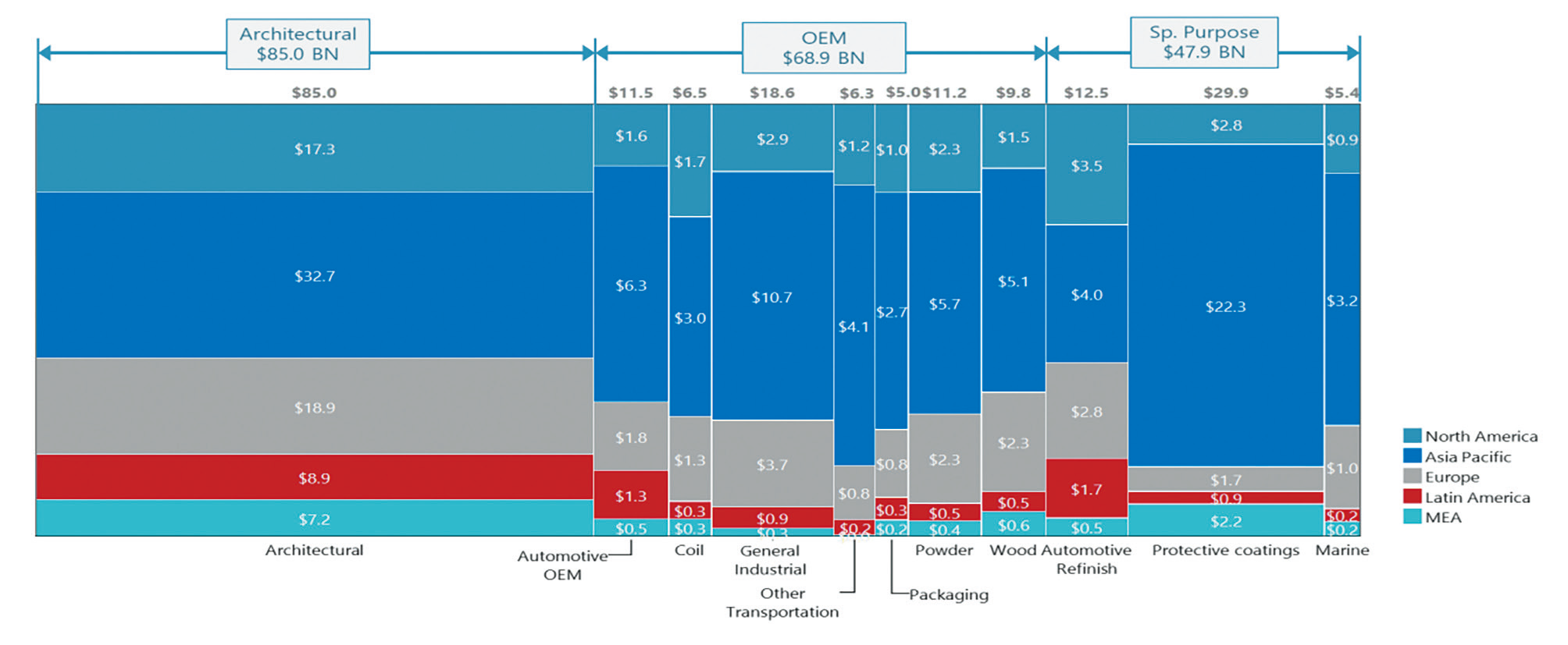 发展中市场(亚太、拉美、中东非洲)规模巨大但单价较低。这些市场同样由装饰建筑涂料主导,占50%-70%以上,但工业与特种涂料份额相对较小。其中亚太的工业漆和特种涂料已形成相当规模,而拉美和中东非洲的工业体系则相对薄弱。