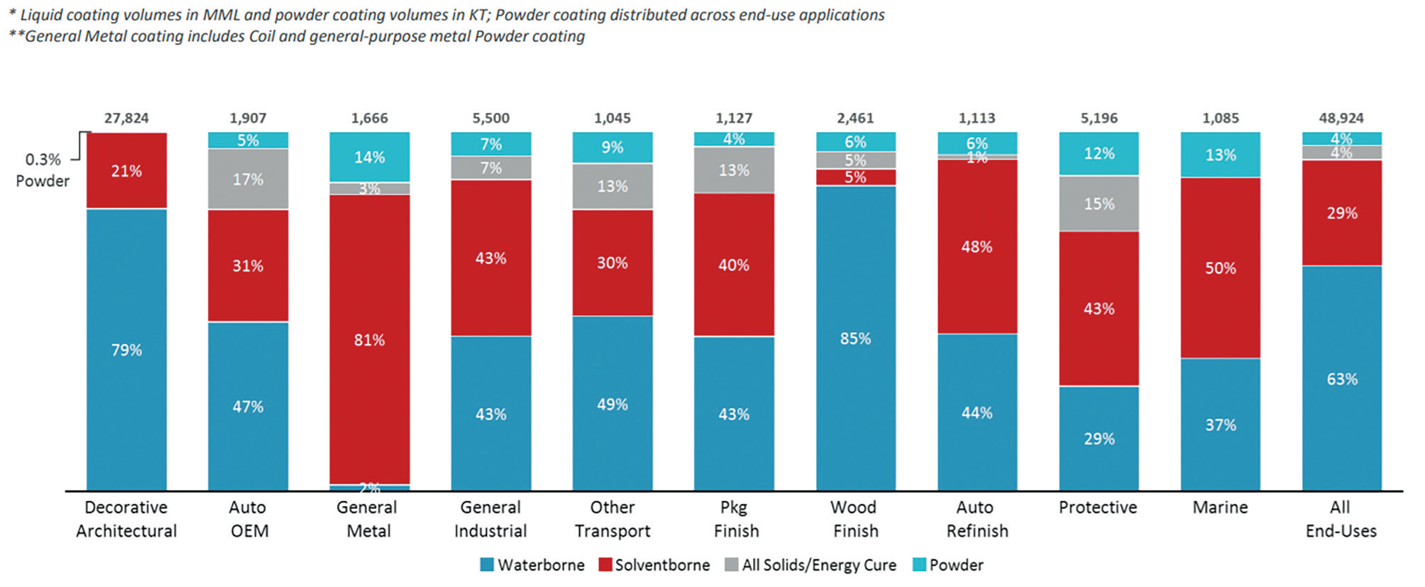 报告还根据不同的涂料技术在终端应用中的分布进行了统计。