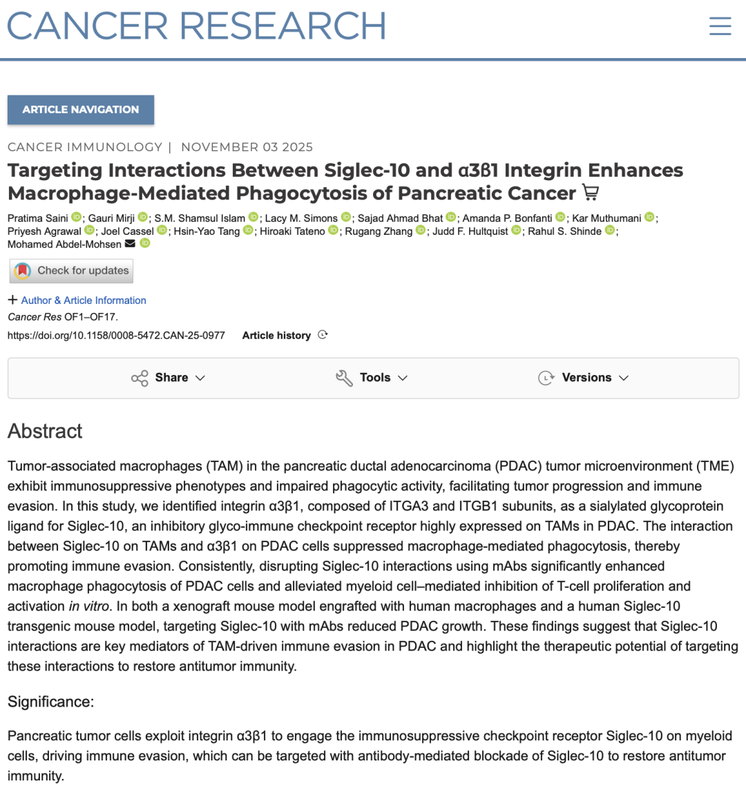 Saini, P., Mirji, G., Islam, S. S., Simons, L. M., Bhat, S. A., Bonfanti, A. P., ... & Abdel-Mohsen, M. (2025). Targeting Interactions Between Siglec-10 and α3β1 Integrin Enhances Macrophage-Mediated Phagocytosis of Pancreatic Cancer. Cancer Research, OF1-OF17.