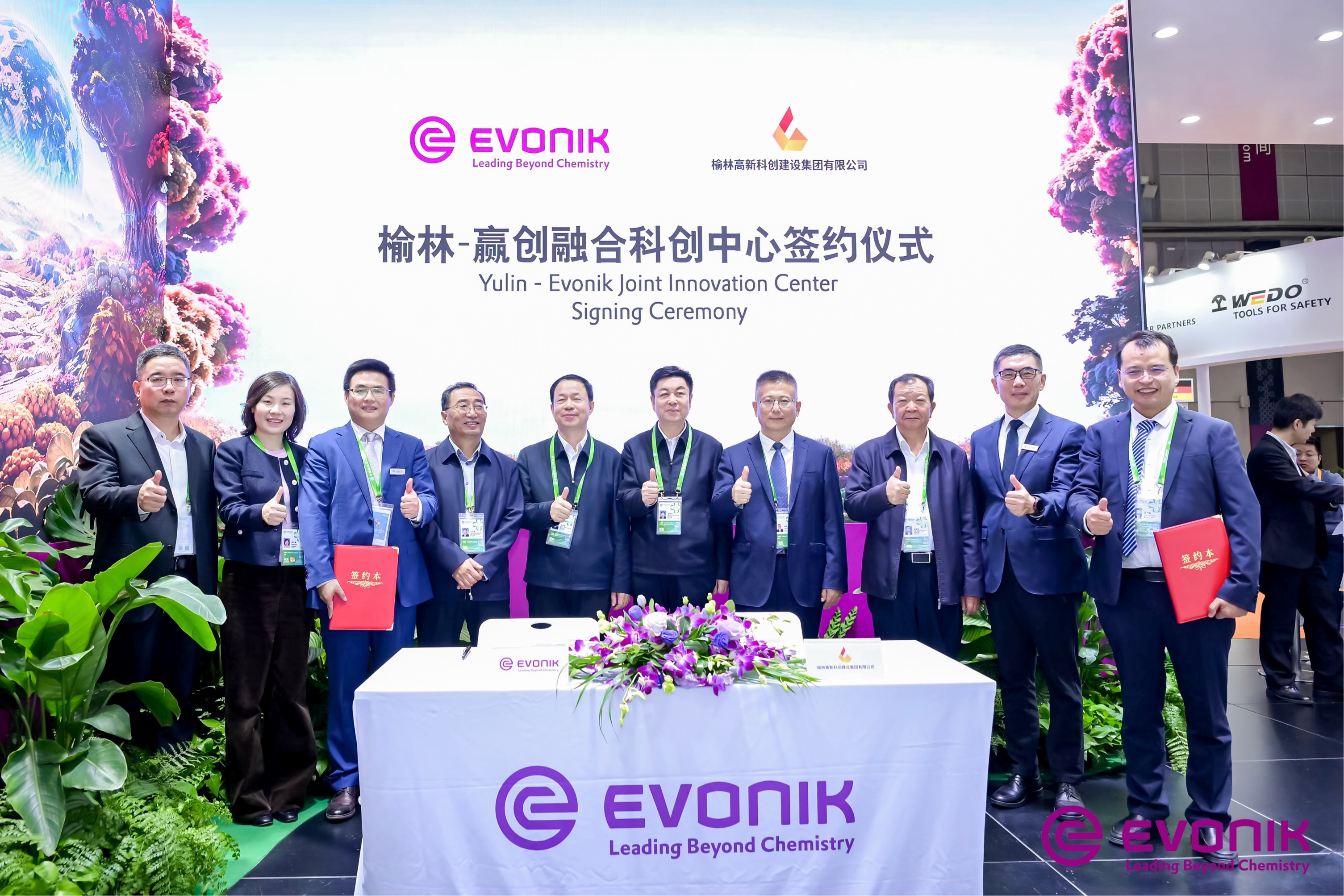 赢创与 361° 在展台联合发布第二代 Mass Balance 低碳环保跑鞋飞燃 5,鞋款中底采用 VESTAMID ECO E40 尼龙 12 弹性体发泡材料,碳排放较传统工艺降低 70%。赢创还与栢特薇集团旗下品牌 MISTINE 蜜丝婷、河北亚东化工集团、旭川化学达成多项战略合作。