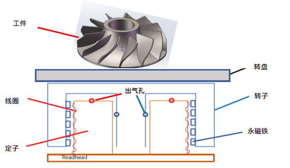 通电后产生磁场,与永磁铁磁场相斥,以保证旋转时定子和转子无干涉