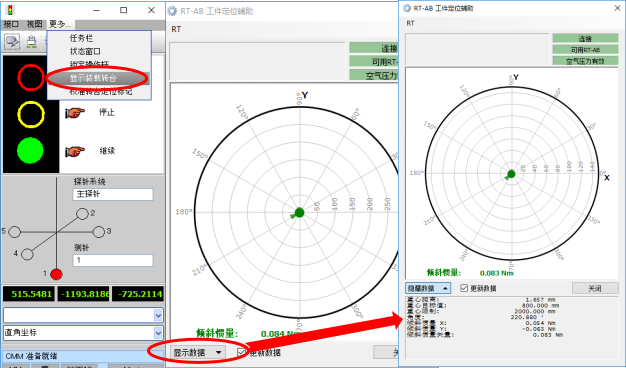 在CALYPSO软件的交通灯界面,更多→显示装载转台→点击左下角显示数据,可以看到当前工件的重心位置和倾斜惯量。