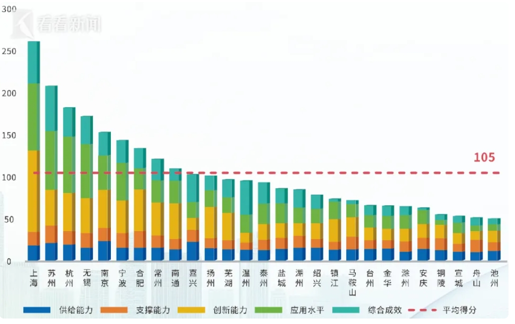 《报告》显示,长三角城市智能制造发展总体呈现以上海为核心引领,苏州、杭州、无锡为三强带动,南京、常州、合肥、宁波、南通为五大重点辐射,多点支撑的总体格局。
