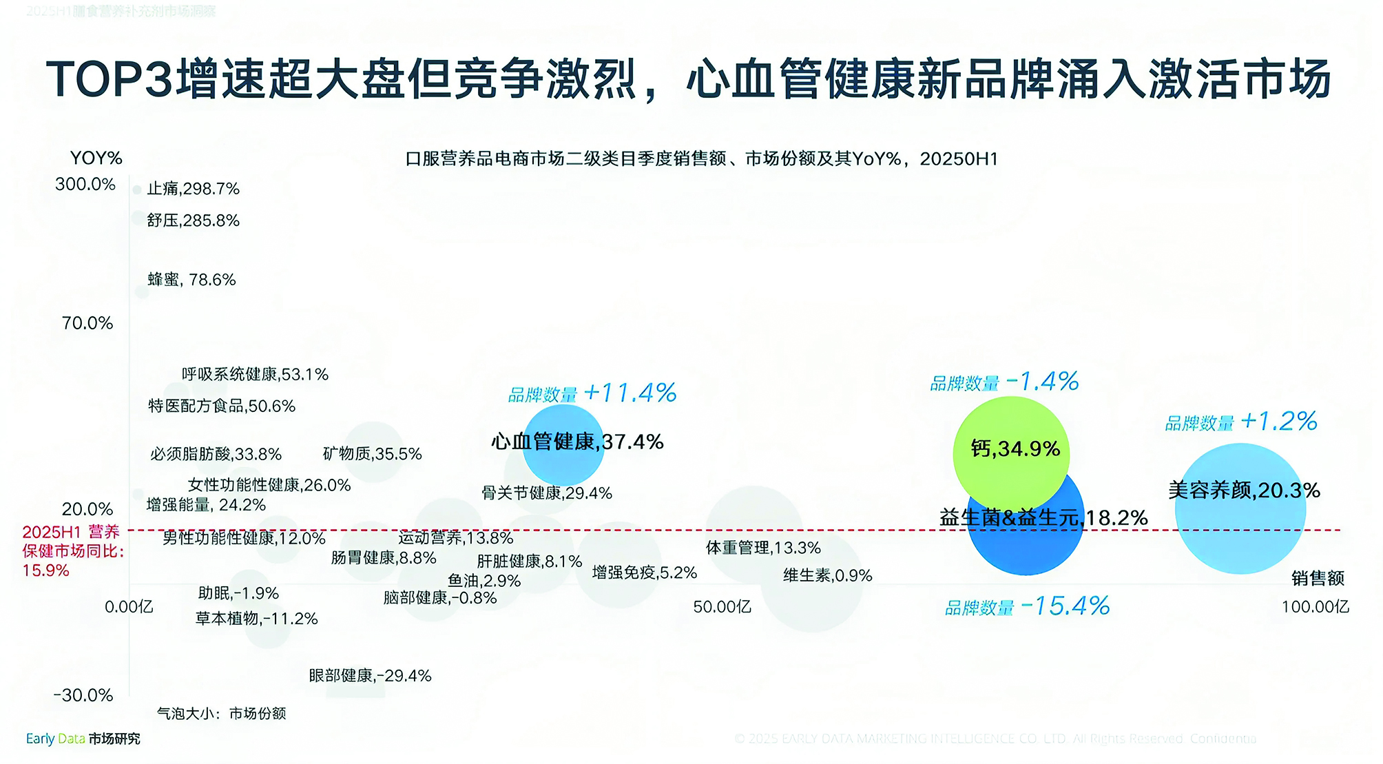 结合2025H1市场表现,膳食营养补充剂行业未来将围绕“全身健康管理”展开。口服美容、钙和心血管健康是市场增长主力。TOP3品类口服美容、益生菌和钙同比增速均超过大盘,其中心血管健康在2025H1同比增长37.4%,三者推动市场整体扩容。