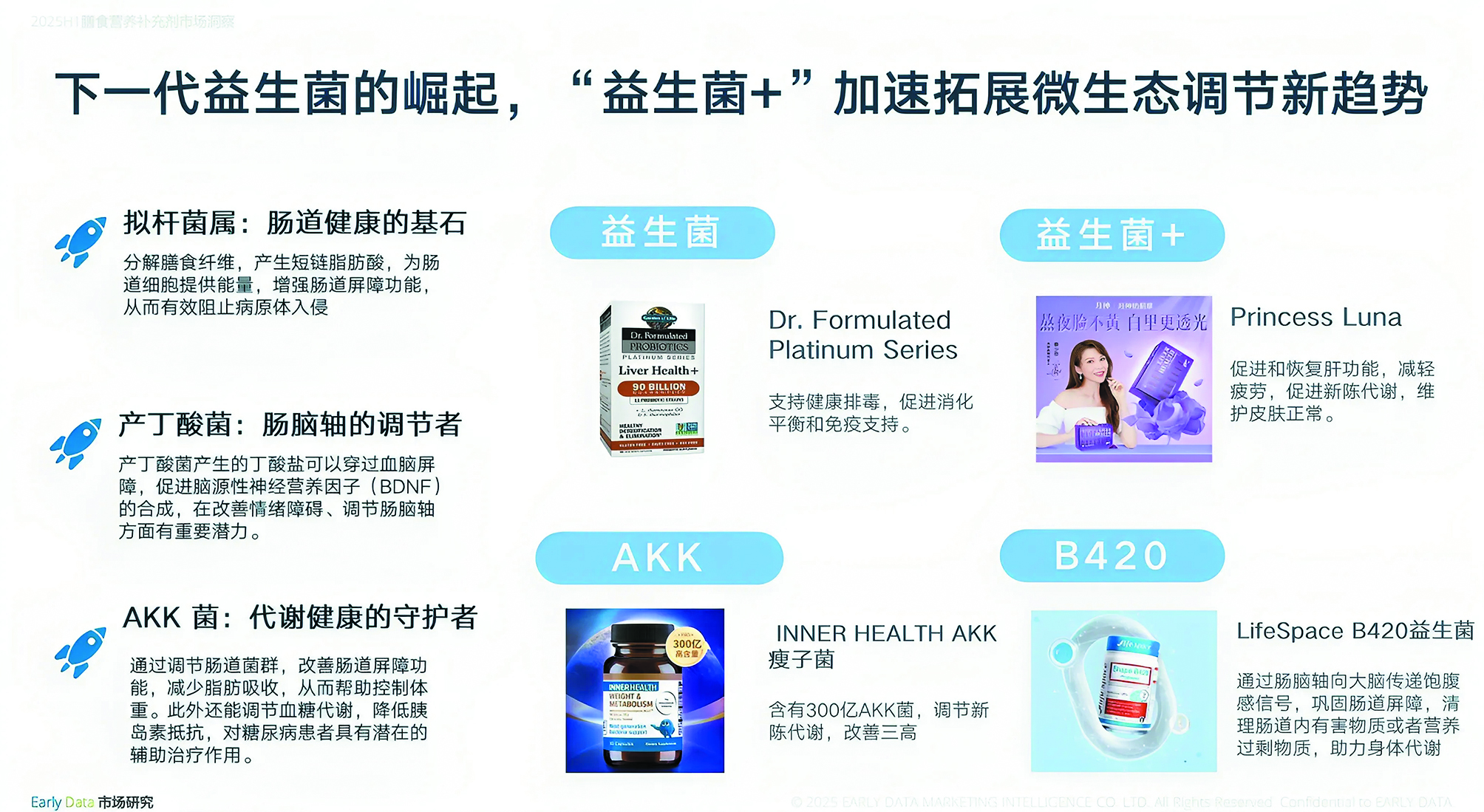 益生菌市场在2025H1表现强劲,销售额同比增长18.2%,占整体市场份额的10.2%。该品类的发展已经远远超出了传统的肠道健康范畴,向更加多元化的功能方向扩展。