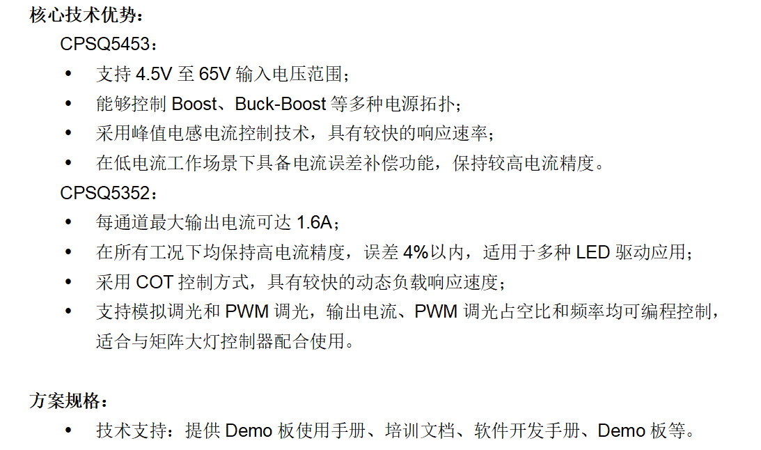 本方案采用高集成度设计,兼具卓越能效表现与稳定性,可充分适配各类应用场景,尤其适用于对响应速度要求严苛的矩阵大灯控制器等应用,不仅能够实现精准调节,还能进一步提升系统监控与管理能力,有力推动智能车灯市场的快速发展。
