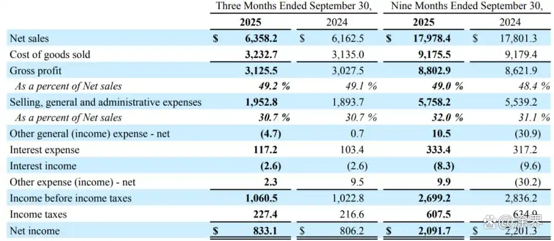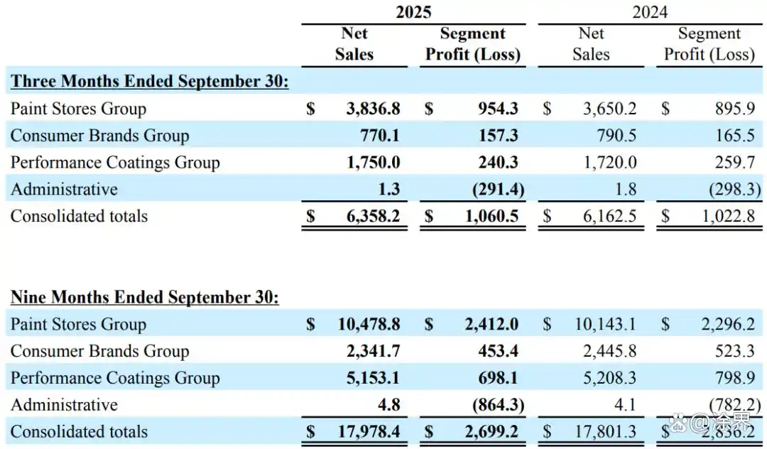 2025年第三季度,宣伟实现综合净销售额为63.582亿美元,同比增长3.2%;所得税前利润10.605亿美元,同比增长3.7%。净销售额增长主要是由于油漆店集团和高性能涂料集团的销售额增加,部分被消费品牌集团的销售额下降所抵消。所得税前利润的增加主要是由于油漆店集团净销售额的增加,部分被油漆店集团长期增长机会的投资增加和与新的全球总部和研发大楼相关的成本所抵消,这些成本记录在行政职能中。