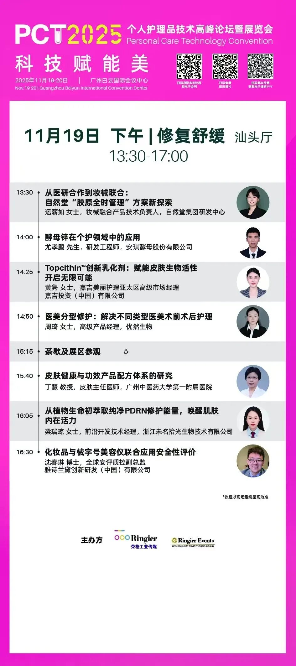 功效化浪潮下,行业需要更多这样的技术交流与思想碰撞。11 月 19-20 日,以「科技赋能美」为主题的 PCT 2025 个人护理品技术发高峰论坛暨展览会 · 广州站将在广州白云国际会议中心举办。10+ 专题论坛、7000 平方米的展区内,260+ 展商精彩亮相、150+ 行业大咖带来真知灼见,处处涌动着化妆品科技创新的澎湃活力。