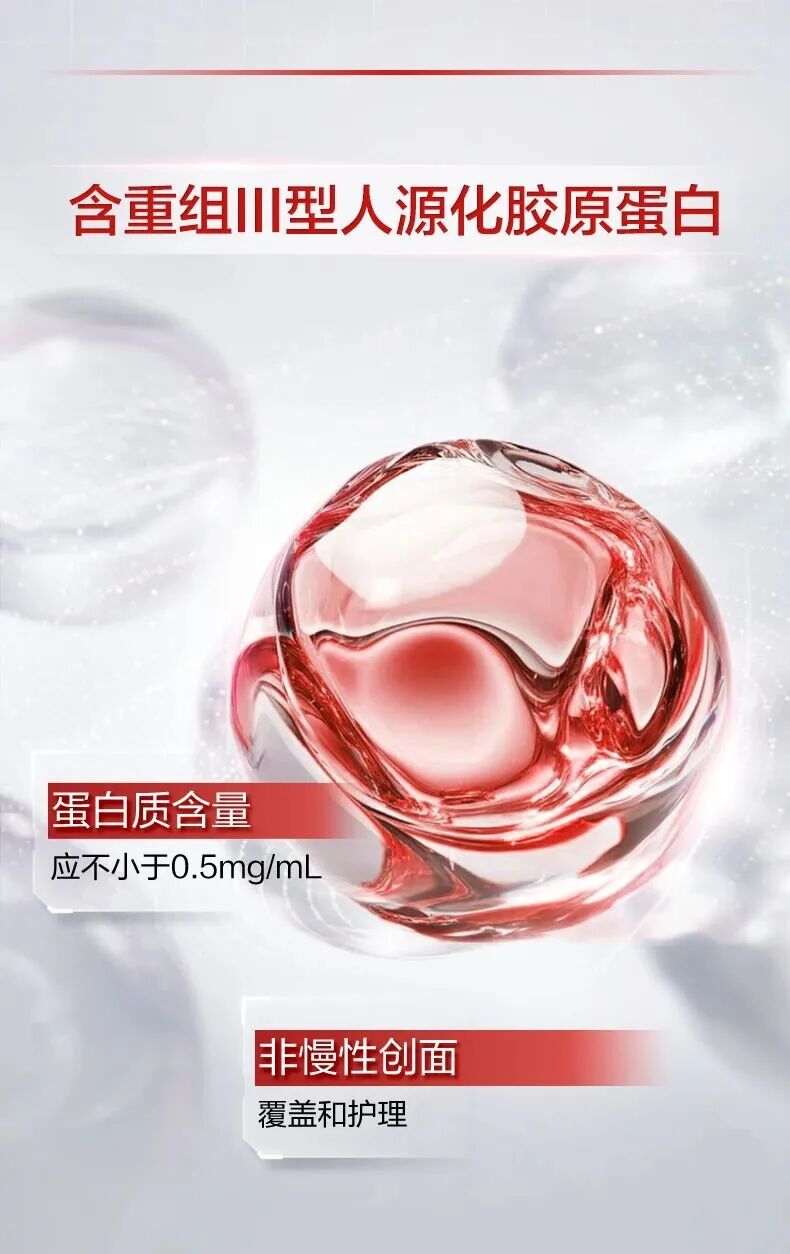 功效定位上,械字号产品聚焦辅助治疗,如重组 Ⅲ 型胶原蛋白贴敷料适用于面部微创术后非慢性创面的覆盖和护理,缓解医美术后肌肤泛红等问题。