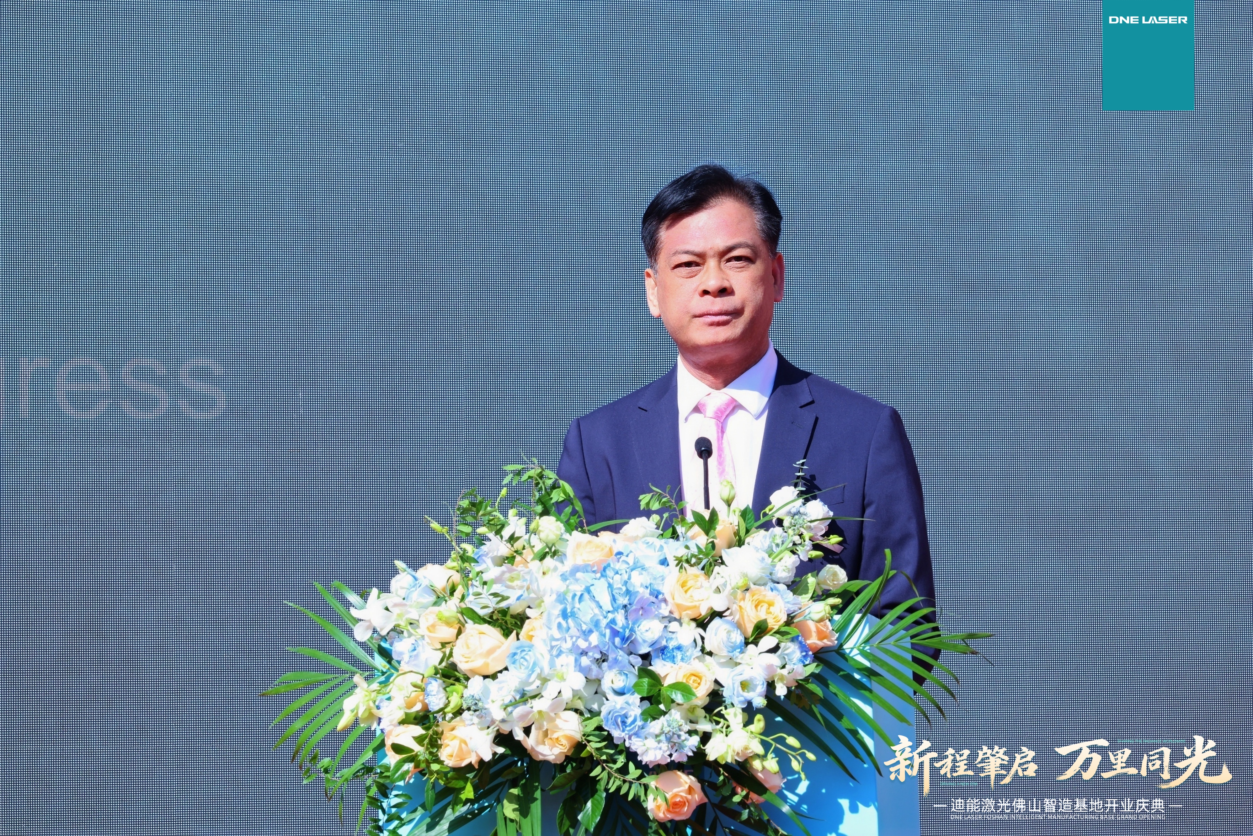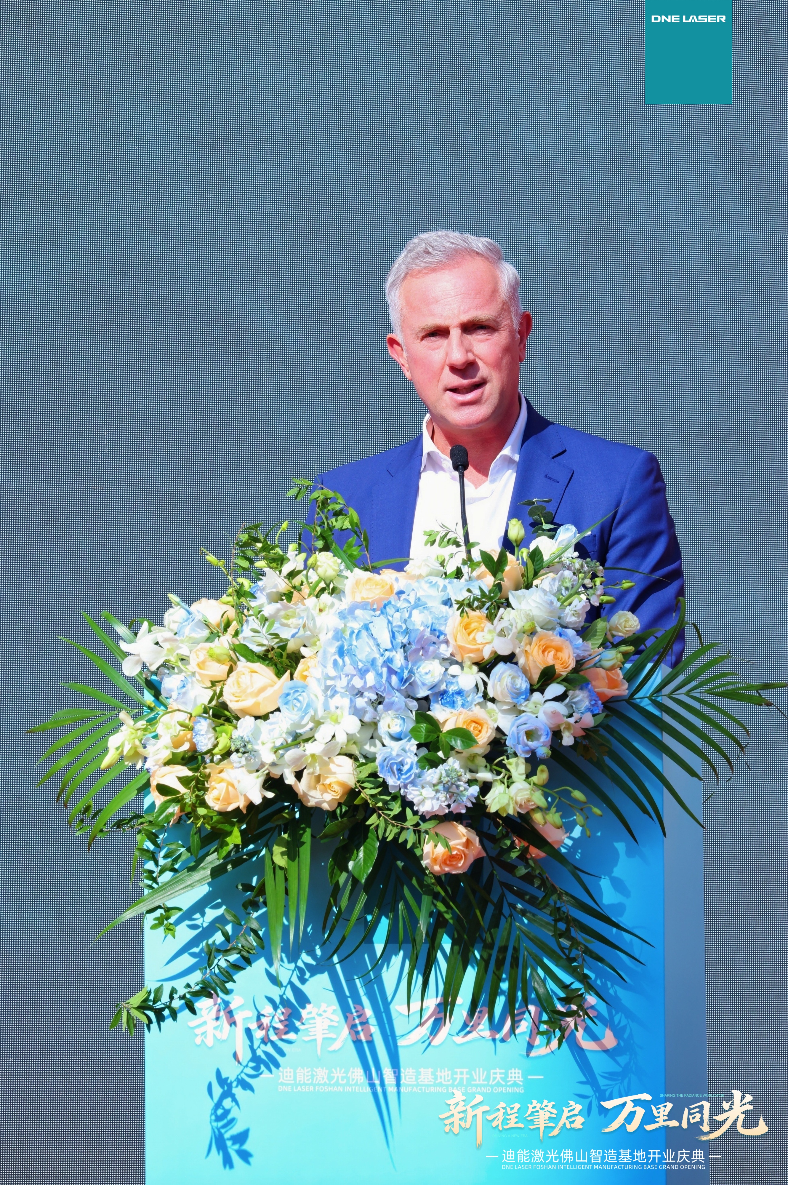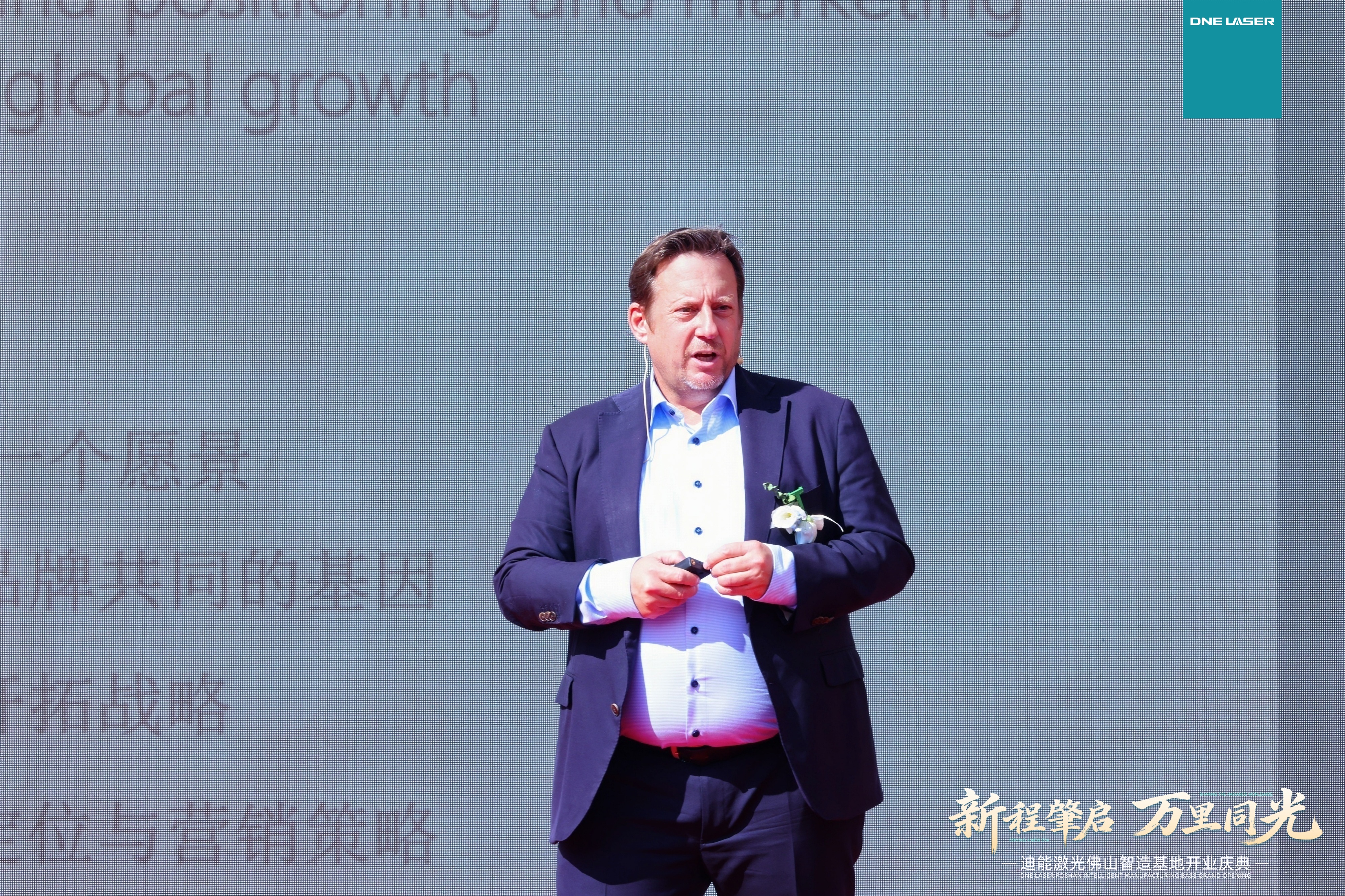 开业仪式上,迪能激光全球CEO游松博士首先致辞,他感谢中国和瑞士政府给予公司的政策支持与悉心指导,感恩客户朋友们长久的信任与相伴,十七载砥砺前行,在这个特殊时刻又见证迪能激光的新辉煌——佛山智能制造基地的盛大开业。随后,游总邀请瑞士百超集团总裁Domenico先生一同上台致辞。
