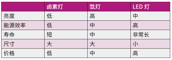 表1总结了这些灯的区别。LED灯比卤素灯亮,但不如氙灯亮。氙灯在夜晚可能过于刺眼。通常,卤素灯仅使用20%的功率来发光,而LED灯可使用80%的功率。尽管LED灯的初始成本较高,但其使用寿命较长、能源效率较高,从长远来看可以节省成本。另外,LED灯更小,为汽车制造商设计前照灯提供了更大的灵活性。