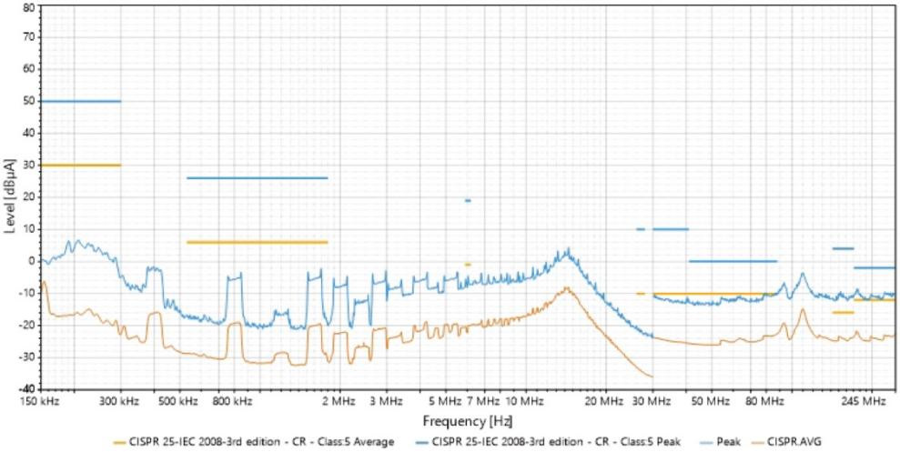 在1A输出至12个LED的相同测试环境下,由于MAX25608的专有电荷泵设计,EMI结果未显示出尖峰,如图9所示。