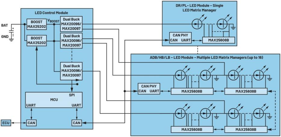 随着汽车电气化和智能化趋势的快速发展,照明系统已成为现在和未来汽车设计中越来越重要的功能。照明系统必须灵活、高效、可靠,而且能创造出更具个性化和艺术化的灯光效果。ADB和AFS被视为高级安全特性。在这些设计中,需要一个准确、高效、可靠的LED管理器来管理LED矩阵。