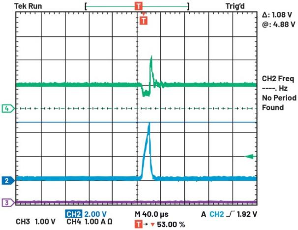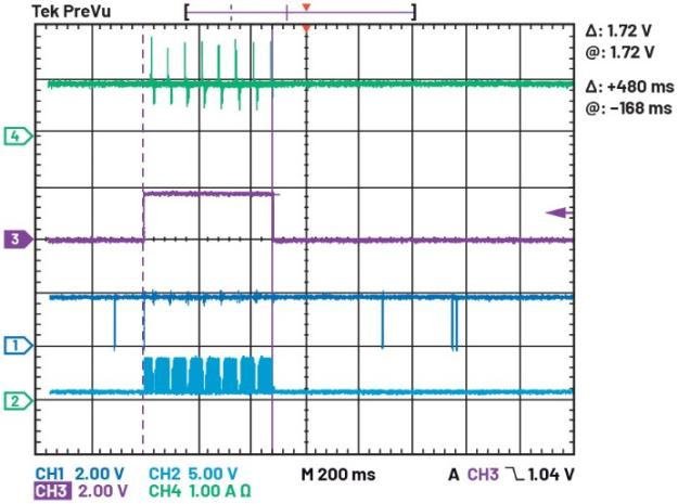 图4.MAX25608 LED短路检测(通道2:漏极电压;通道3:FLTB;通道4:LED电流)