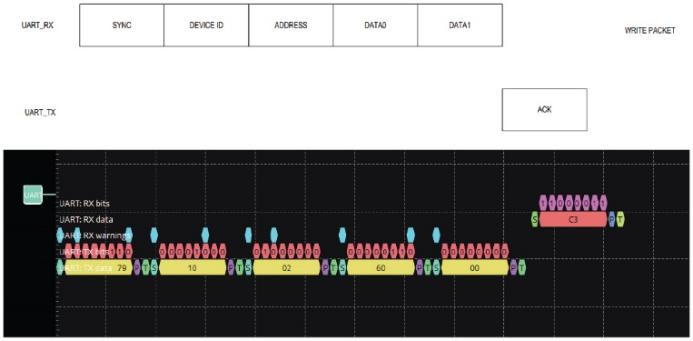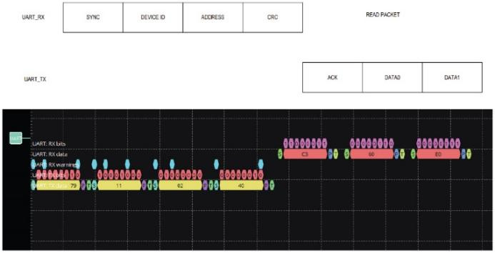 ADI公司的MAX25608可在微控制器和多达16个MAX25608器件之间提供多点通用异步接收器-变送器(UART)通信。写入和读取命令示例如图5和图6所示。为了确保数据安全,使用数据包上的3位循环冗余校验(CRC)来保护读/写事务。如果微控制器发送的数据包的CRC不正确,则MAX25608不应答并放弃此次通信。