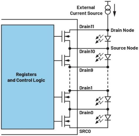● 灵活性:支持多个IC来管理大量LED像素;设计人员可以配置LED灯组,例如1串×12串联开关和2串×6串联开关。