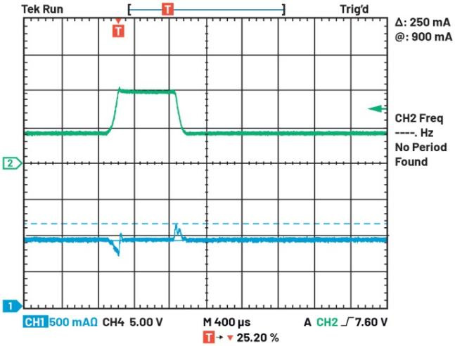 MAX25608由MAX25600 H桥LED驱动器驱动,每个通道有两个LED。ADI为MAX25600增加了一个4.7μF输出电容和一个滤波器(1μH + 0.1μF)。调光时的电流尖峰测量如图10所示。