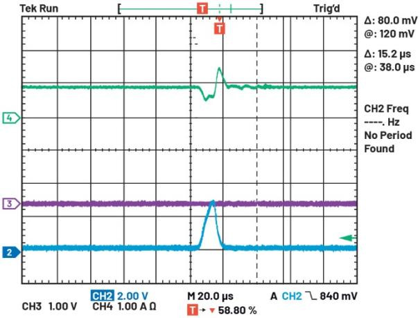 图3.MAX25608 LED开路检测(通道2:漏极电压;通道3:FLTB;通道4:LED电流)