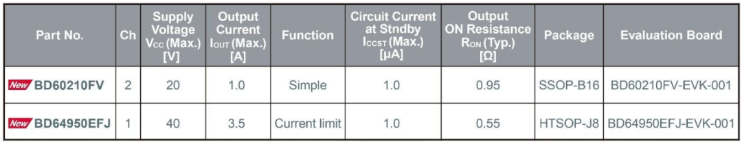 新产品已经开始量产(样品价格300日元/个,不含税),并已开始通过电商进行销售,均可购买( BD60210FV 、 BD64950EFJ )。另外,ROHM还提供可助力应用产品开发和设计的评估板(BD60210FV-EVK-001、BD64950EFJ-EVK-001)。