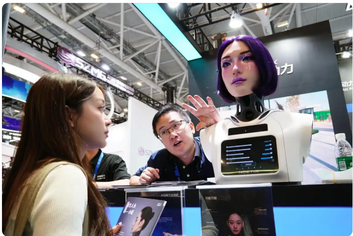 近日,观众在第二十七届中国国际高新技术成果交易会上了解可模仿复杂表情的仿生机器人。新华社记者 王丰 摄