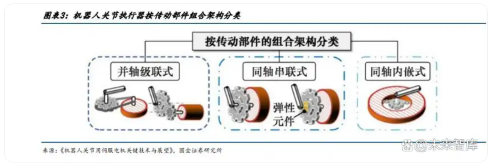 机器人执行器的传动架构主要分为三类:(1)并轴级联式采用电机与减速器径向排列但输出轴非同轴 布置,(2)同轴串联式实现电机与减速器沿同轴排列,(3)同轴内嵌式将减速器集成于电机内部形成 同轴排列。这些架构直接影响电机尺寸约束和系统输出特性。