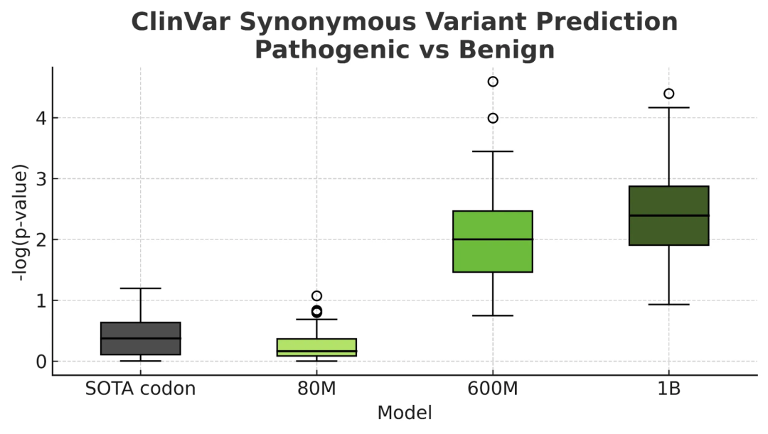 精准预测“沉默”突变风险:传统观点认为不改变氨基酸的同义突变是“沉默”的,但 CodonFM 证明这些突变可能通过改变翻译效率或 mRNA 结构引发疾病。模型在 ClinVar 数据集上的测试显示,其区分致病性与良性同义突变的能力超越了现有的 RNA 基准模型。